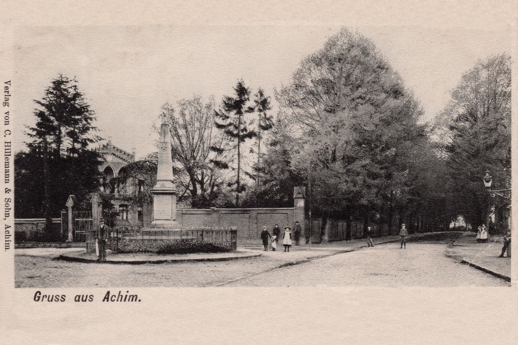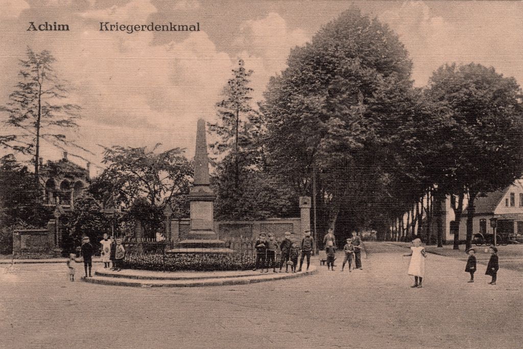 Ehrenmal zur Erinnerung an die gefallenen Soldaten aus dem deutsch-französischen Krieg von 1870/1871. Der Entwurf stammt von Hinrich Meislahn. Am unteren Teil des Denkmals befinden sich die Namen der gefallenen Soldaten. Das Denkmal stand zuvor an der viel befahrenen Bahnhofstraße. Da ein Pferdegespann dagegen fuhr und die Pferde notgeschlachtet werden mussten, wurde auf Beschluss des Gemeinderats der Standort des Denkmals in den Achimer Rathauspark verlegt.
